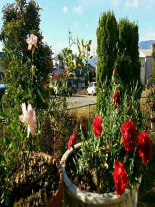 連日の寒波襲来の最中、寒さに耐えて可憐に花を咲かせている薔薇とカーネーション