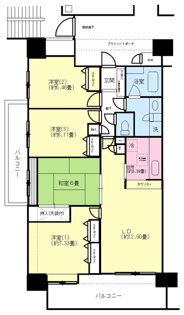 | 設備 | 給湯、BT別、シャワー、追焚、脱衣所、洗面所独立、シャワー付洗面化粧台、温水洗浄便座、3点給湯、角部屋、南西角部屋、出窓、バルコニー、2面バルコニー、南面2室、南面リビング、LDK15畳以上、玄関ホール、収納、クロゼット、押入、天袋、下駄箱、物置、収納3ヵ所、クロゼット3ヵ所、TVモニタ付ドアホン、オートロック、エレベーター、ゴミ置場、インターネット接続可、地上デジタル、BS、24h管理、敷地内ゴミ置き場、システムK、グリル、分譲タイプ、[管理員区分]常駐、オートバス、当社管理物件、都市ガス、室内洗濯機置場、ガスコンロ三口設置済み | ||