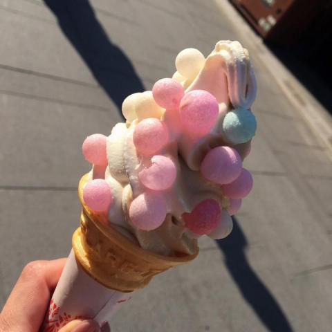 皆様ご存知ですか?このソフトクリームの上にのっているカラフルなお菓子が