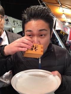 増川さんは枡酒をゴクリ
