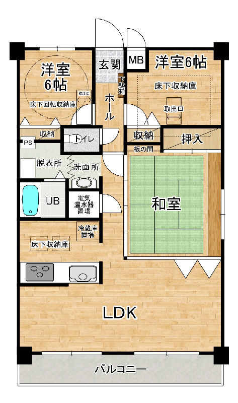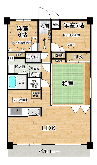| 設備 | 給湯、BT別、浴室乾燥機、洗面所独立、シャワー付洗面化粧台、温水洗浄便座、バルコニー、フローリング、収納、下駄箱、床下収納、TVモニタ付ドアホン、エレベーター、駐輪場、CATV、システムK、カウンタK、オール電化、エアコン、室内洗濯機置場、IHコンロ三口 | ||
