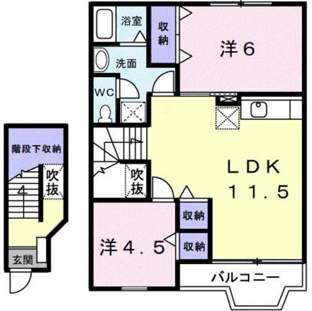 | 設備 | 給湯、BT別、シャワー、洗面所独立、シャワー付洗面化粧台、最上階、バルコニー、フローリング、24時間換気システム、下駄箱、階段下収納、TVモニタ付ドアホン、駐輪場、BS、CS、CATV、24h管理、2×4工法、エアコン、室内洗濯機置場 | ||
