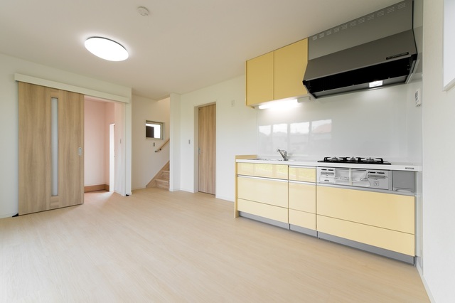 1階と2階が使えるテラスハウス!1階にはウッドデッキ付き! 人口大理石天板システムキッチン・3口コンロ付・ペアガラス |