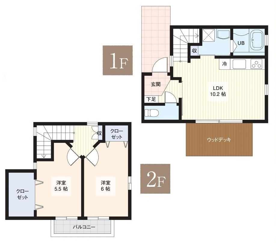 | 設備 | 給湯、BT別、シャワー、追焚、浴室乾燥機、脱衣所、洗面所独立、シャワー付洗面化粧台、温水洗浄便座、3点給湯、角部屋、ウッドデッキ、バルコニー、メゾネット(1階-2階)、クロゼット、下駄箱、TVモニタ付ドアホン、地上デジタル、システムK、シャッター雨戸、エアコン、室内洗濯機置場、ガスコンロ三口設置済み | ||