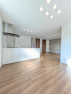 19帖のLDKです・キッチンは対面タイプ・ダウンライトもオシャレです