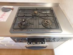 キッチンは3口ガスコンロ設置済みシステムキッチン完備